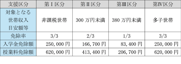 表)入学金と授業料の減免の詳細(2025年度予定)